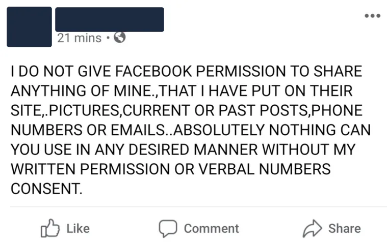 I was recently delivering a security awareness training session for a client I was delivering a Security Awareness Training for a client in 2023, and was hit with a question that took me back to about 2015; "Sometimes you see those facebook posts that declare that you don’t give them permission to use your data and things like that - does that hold any water?"It blasted me back to when I would sit at my laptop as a 15 year old facebook user and see these armchair solicitors - in very good faith, copy and paste viral statements regarding the new exploitation of your information by facebook or twitter, and attempt to opt-out of it with a legalese-ridden post.